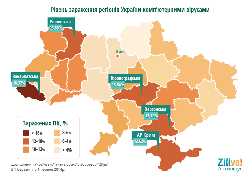 Українська Антивірусна Лабораторія «Zillya!» провела дослідження вірусної активності на території України за період з березня по червень 2014 року та створила карту зараження регіонів України комп’ютерними вірусами.